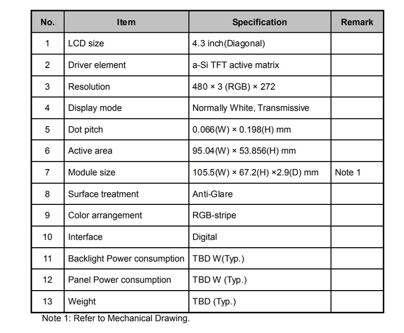 品名: 4.3寸電容觸摸顯示屏