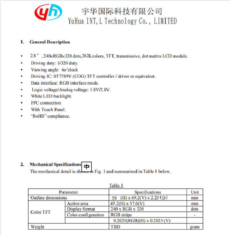 品名: 2.8寸液晶顯示屏